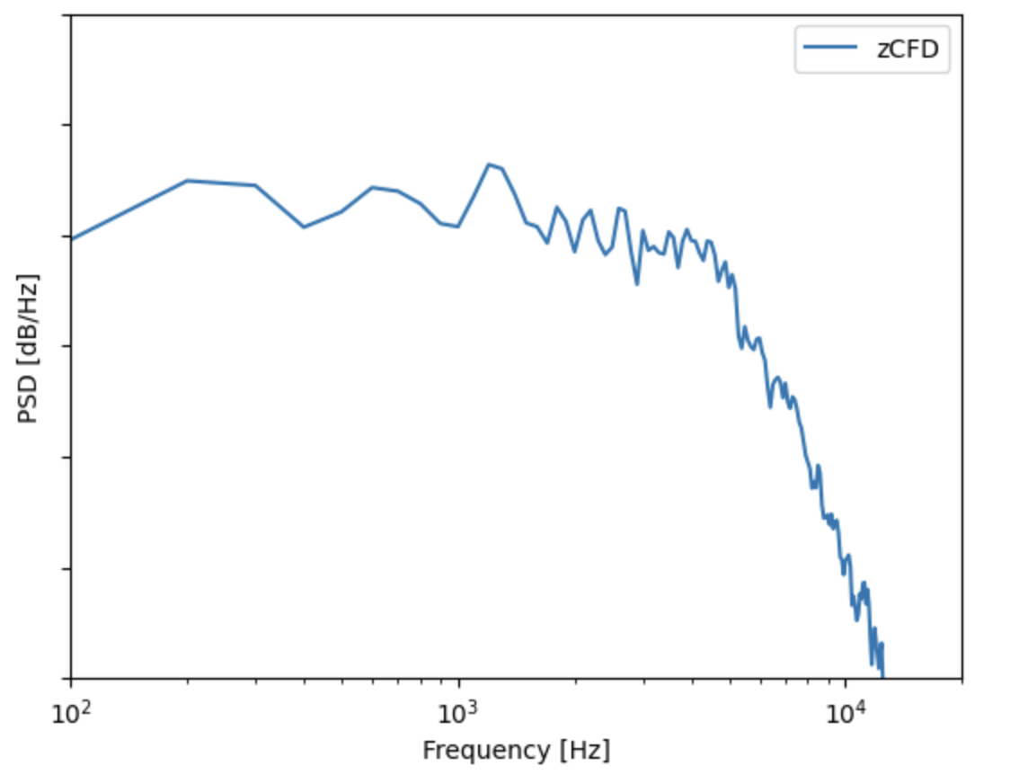 The acoustic.ipynb uses Pandas to read in the acoustic pressure data within the _MP2 file (this file contains the acoustic pressure history at monitor point 2 as specified in the Python dictionary). This signal is then checked to find where the acoustic waves meet the observer and is appropriately clipped, removing samples where there were no acoustic waves. The time signal of acoustic pressure is then processed using SciPy, and in particular, Welch’s method. Finally the PSD is plotted using Matplotlib. All modules are available within the zCFD environment.