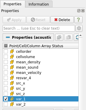 To conduct post-processing of the aeroacoustic simulation, open Paraview and load the .pvd generated in the OUTPUT folder. Since we are only interested in the acoustics, it may be useful to only have ‘var_1’ selected in the ‘Point/Cell/Column Array Status’ options as this corresponds to acoustic pressure.